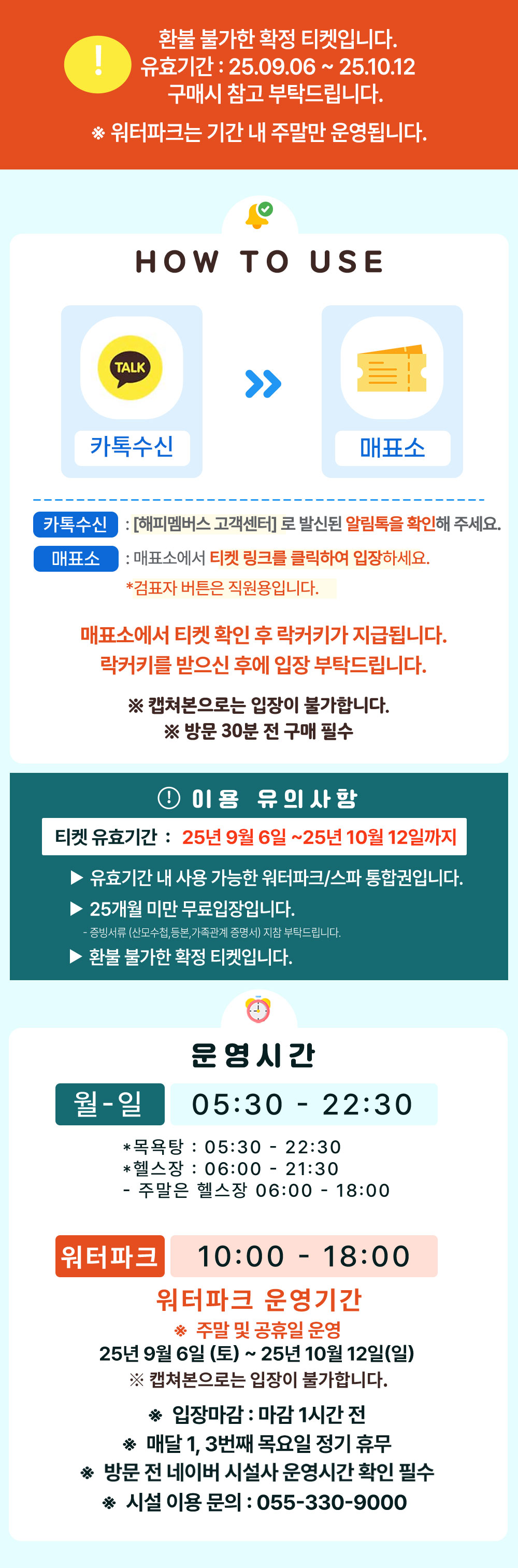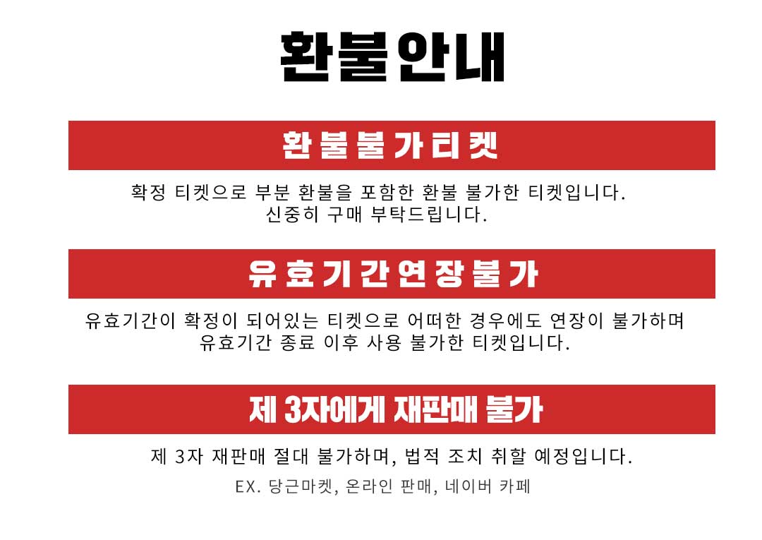 - 제 3자 재판매 불가하며 적발 시 티켓은 사용 불가하도록 폐기 처분 됩니다. 폐기 처분 된 티켓은 당사에서 책임지지 않습니다.